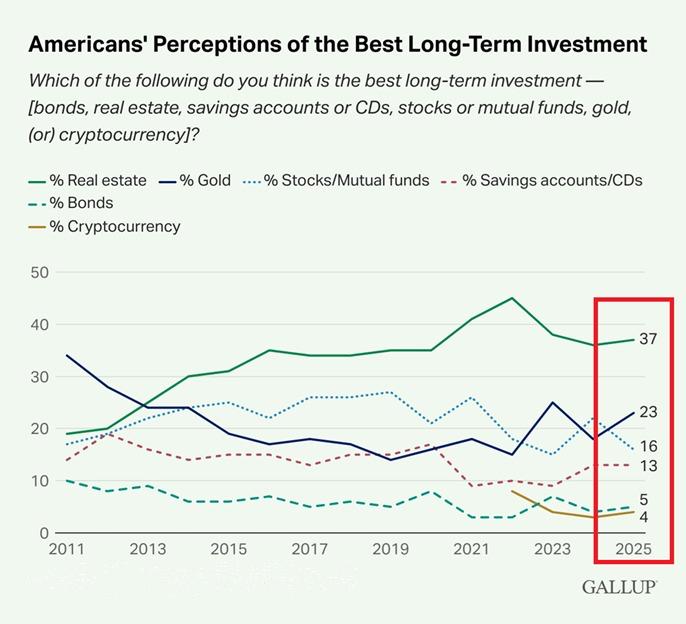 37% американцев назвали недвижимость лучшим вложением денег. На втором месте золото с показателем в 23% - лишь 16% выбрали акции и фонды.